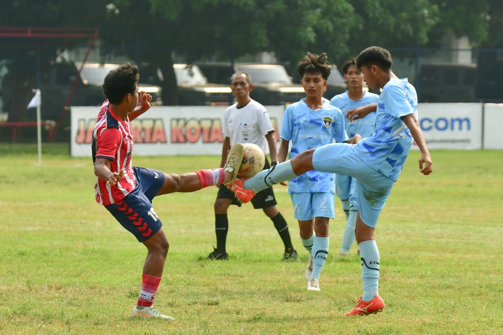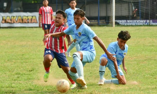 Adu kaki memperebutkan bola antara pemain Farama- (strip merah-putih) Tunas Betawi (biru muda). foto: Tjandra M. Amin